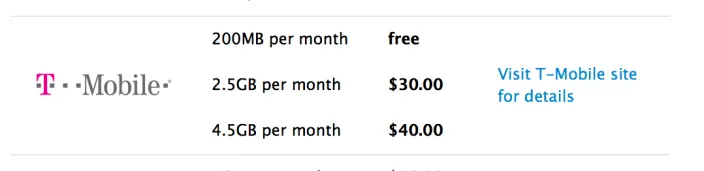 T-Mobileのウェブサイトでは現在、年間契約なしのブロードバンドプランが、100MBの週パスで100ドル、1GBの月パスで30ドル、3GBの月パスで50ドルで掲載されています。5月20日に新プランが旧プランに置き換わると予想されます。